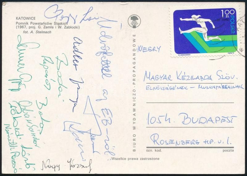 Beschreibung: 1975 Bokszolók (Papp László, stb.) aláírásai EB-ről küldött levelezőlapon