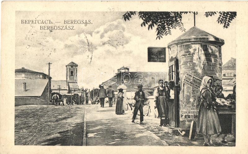 Beschreibung: Beregszász, Berehove; utcakép piaccal és hirdetőoszloppal / street view with market and advertising column "1938 Beregszász visszatért" So. Stpl