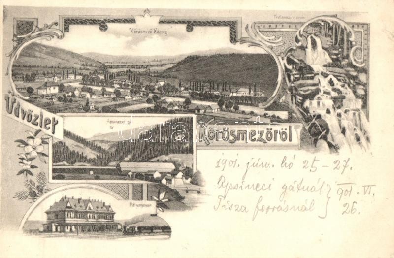 Kőrösmező, Yasinia, Jassinja, Jasina; Aspineczi-gát, Trufaneczi vízesés, vasútállomás. Korabeli nyomat / dam, waterfall, railway station, Floral, Art Nouveau
