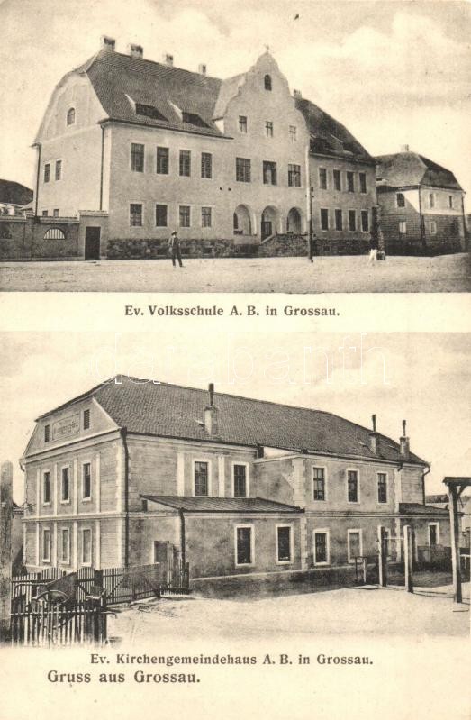 Kereszténysziget, Grossau, Cristian; Ev. Volksschule, Ev. Kirchengemeindehaus, Verlag Joh. G. Connert / Evangélikus iskola és plébánia / school and parish house (EK)