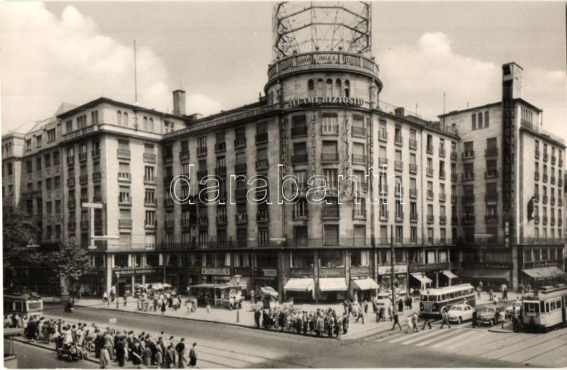 Budapest VIII. Rákóczi út és Tanács körút (Károly körút) sarok, villamosok, autóbusz, automobilok, üzletek, Állami Biztosító, Országos Takarékpénztár, Képzőművészeti Alap kiadása