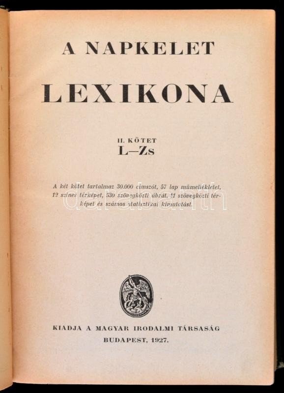 A Napkelet Lexikona I-II. Bp., 1927, Magyar Irodalmi Társaság. Kiadói aranyozott gerincű egészvászon-kötés, kissé kopottas borítóval, és kissé sérült gerinccel, de egyébként jó állapotban.