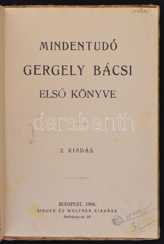 Gárdonyi Géza: Mindentudó Gergely bácsi első könyve. Filléres könyvtár. Szerk.: Pósa Lajos. Bp., 1906, Singer és Wolfner. 2. kiadás. Kiadói illusztrált félvászon-kötés, kissé kopottas borítóval, de egyébként jó állapotban.
