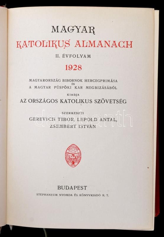 Magyar Katolikus Almanach. II. évf. Szerk.: Gerevich Tibor, Leopold Antal, Zsembery István. Kiadja Országos Katolikus Szövetség. Bp., 1928, Stephaneum Nyomda és Könyvkiadó Rt. Kiadói aranyozott egészvászon-kötés, kissé sérült kötéssel.