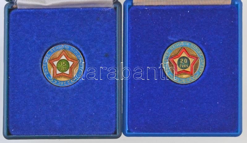 Beschreibung: ~1970-1980. "Önkéntes Rendőri Szolgálatért" 15 és 20 éves, aranyozott, zománcozott jelvény tokban (2xklf) egyik tok sérült T:1-,2