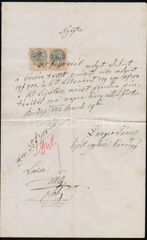 1883 Budapest Lipótvárosi Plébánia nyugtája, 10 kr. és 3 kr. okmánybélyeggel, Langer János (1819-1889) zeneszerző, egyházi karnagy, Szent István-bazilika kántorának aláírásával