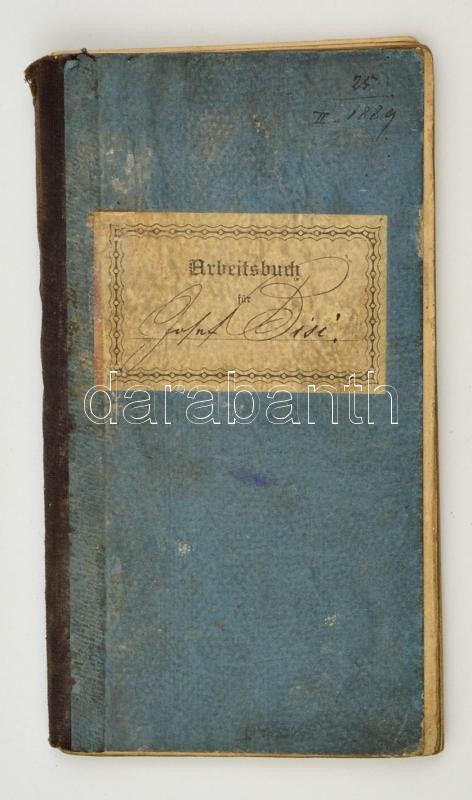 1887-1893 Munkakönyv kéményseprő segéd részére, első sorban osztrák, kisebb részben magyar bejegyzésekkel, Bécs, Langenzdorf, Purkersdorf, Pozsony, Csorna, német és magyar nyelven, kissé viseltes állapotban. / 1887-1893 Worker's Book for chimney sweep assistant, with Austrian and Hungarian writings (Wien, Langenzdorf, Purkersdorf, Bratislava, Csorna), in German and Hungarian language, little bit poor condition.