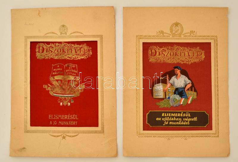 Beschreibung: cca 1950 2 db selyem ill. szövet elismerő díszoklevél
