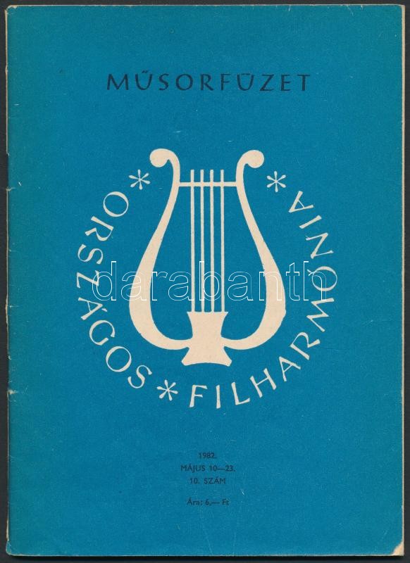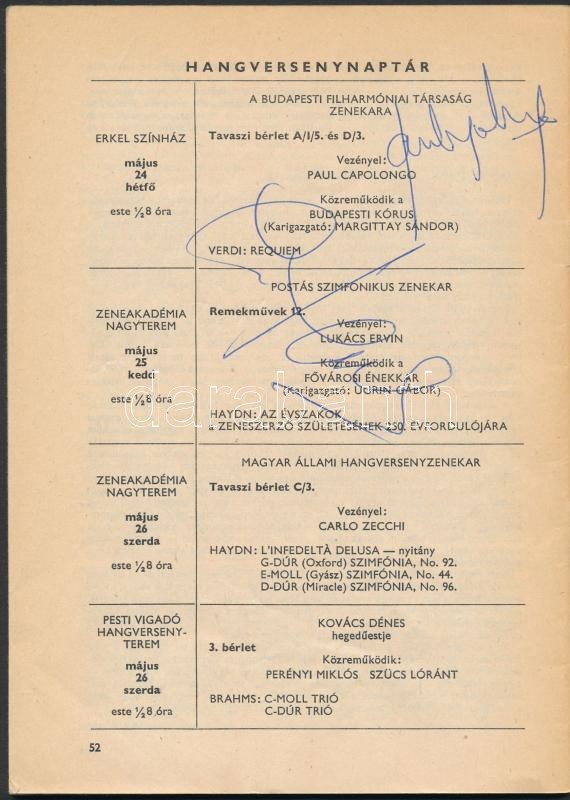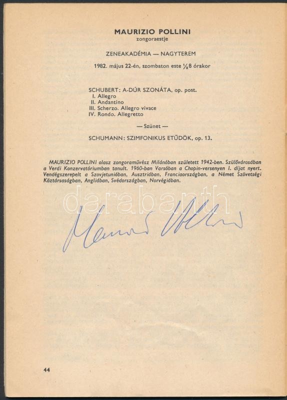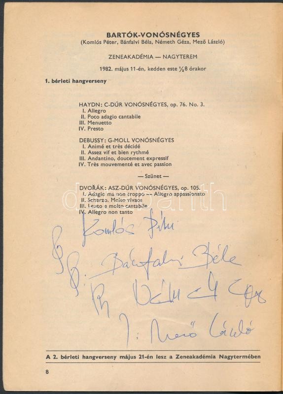 Országos Filharmónia műsorfüzet 1982. május 10-23. 10. szám. Összesen 23 művész aláírásával, többek közt: Bartók-vonósnégyes tagjai, Vásáry Tamás (1933-) karmester, Maurizio Pollini (1942-) zongoraművész
