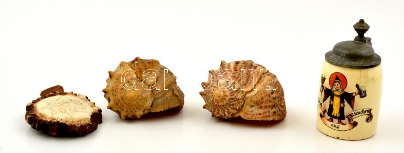 Beschreibung: Akvárium kellékek: 2 db csigaház, 7×7 cm, ón fedeles mini korsó (hajszál repedéssel), sérült medál
