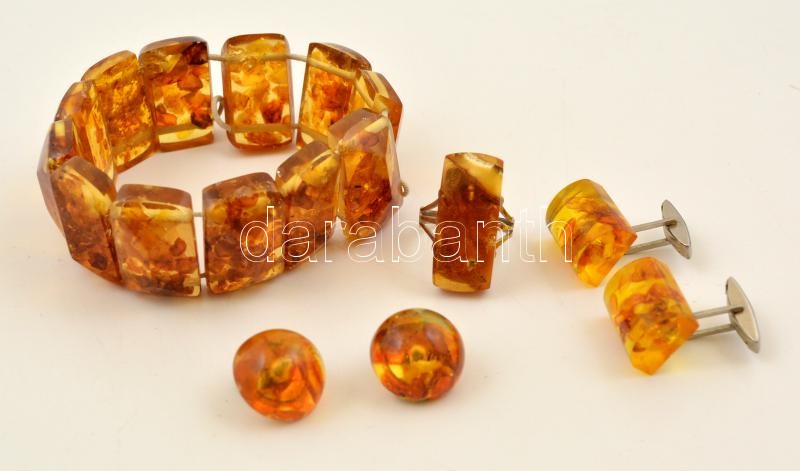 Beschreibung: Borostyánszínű karkötő (hiányos?) + mandzsettagomb-pár, fülklipsz-pár, gyűrű; összesen 4 db