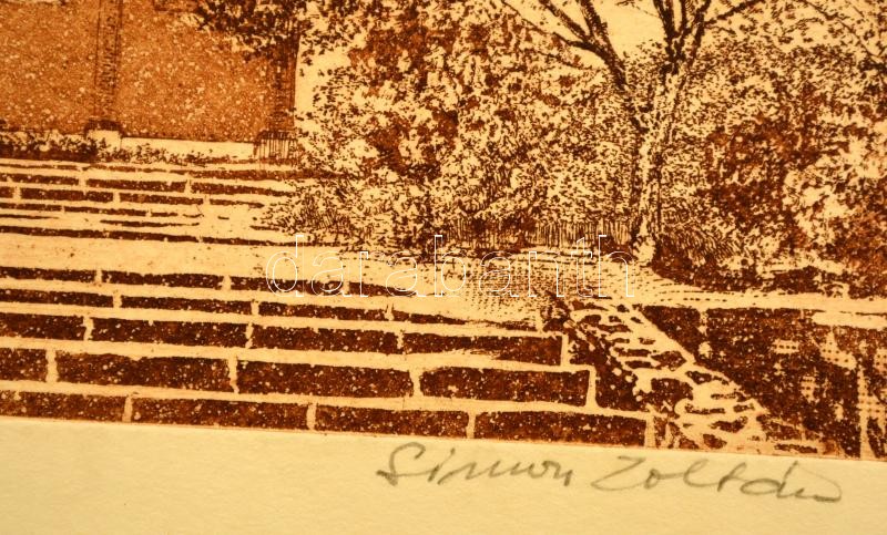 Beschreibung: Simon Zoltán (1950-): Pécs, Székesegyház. Színes rézkarc, papír, jelzett, 20×28 cm