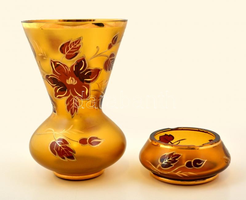Beschreibung: Üveg tétel, 2 db: Dekoratív üveg váza és tálka, kézzel festett, jelzés nélkül, kopott, a tálkán lepattanásokkal, m:25,5 cm és 7 cm