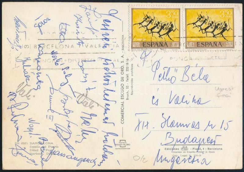 Az Újpest játékosainak aláírásai Spanyolországból küldött levelezőlapon: Zámbó, Tóth, Nuskó, Göröcs Jani, Nagy Laci, Káposzta, Dunai II., Dunai III., Solymosi, Juhász, Bene Feri, Farsang