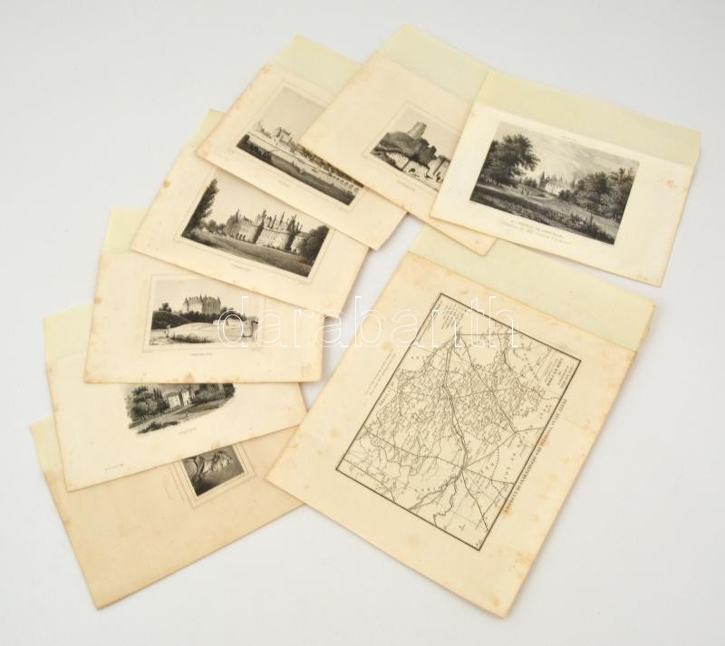 1839 Franciaország Loir-et-Cher megyéjének acélmetszetű térképe, valamint 6 acélmetszetű kép annak településeiről, kastélyairól (Blois,Chambord,Chaumont,Vieuvy,Lavardin,Chateau de Lierville), és egy acélmetszetű kép Pierre de Ronsard (1524-1585) francia költőről. Összesen 8 db. Panorama Pittoresque de la France. Paris, 1839, Firmin Didot. c. kiadványből. Egy illusztráció hiányzik, Chateau de Lierville. Francia nyelven./ 1839 Steel engraving map of Loir-et-Cher, department of France,and 6 steel engraving illustrations about the towns and castles of Loir et Cher(Blois,Chambord,Chaumont,Vieuvy,Lavardin,Chateau de Lierville), and a steel engraving illustrations about Pierre de Ronsard (1524-1585)French poet, all: 8 pieces. In: Panorama Pittoresque de la France. Paris, 1839, Firmin Didot. One illustration lost, Chateau de Lierville. In French Language.