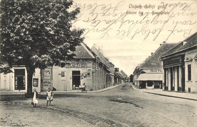 Beschreibung: Eszék, Osijek, Esseg; Fő tér, Nendtvich üzlete, takarékpénztár / Glavni trg / Hauptplatz / main square, shops, savings bank