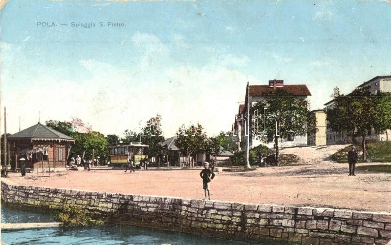 Pola, Spiaggia S. Pietro / beach, tram (EK) https://www.darabanth.com/de/299-Fernauktion/299.0/Ansichtskarten/Kroatien~500011/Pola-Spiaggia-S-Pietro-beach-tram-EK~II1599645