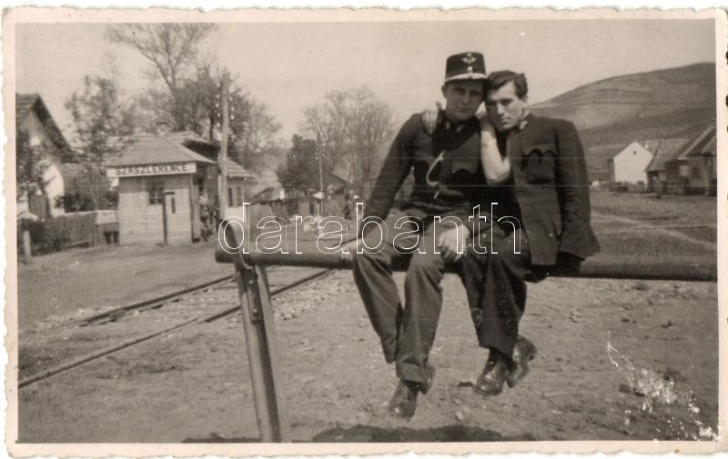 Beschreibung: Szászlekence, Lekence, Lechnitz, Lechnita; vasútállomás, vasutasok / railway station, railwaymen, photo (EK)