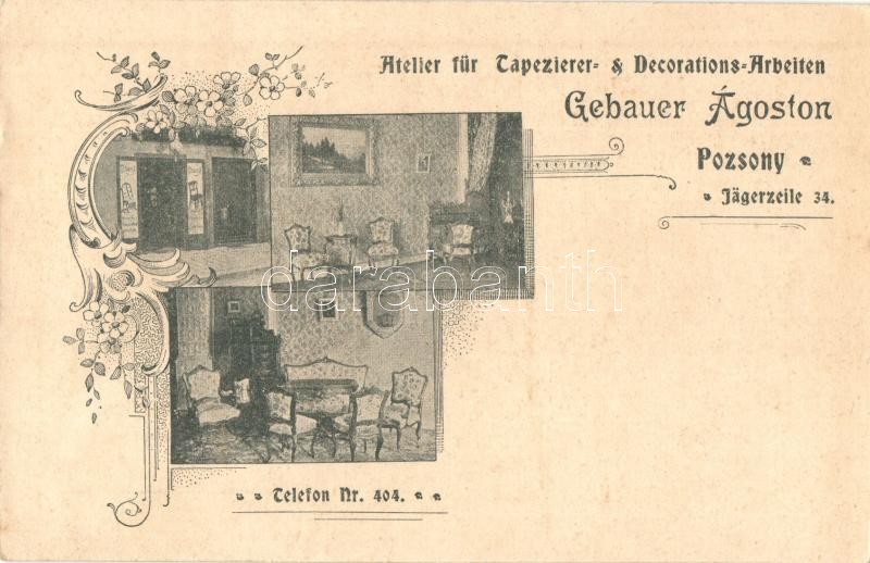 Pozsony, Pressburg, Bratislava; Jägerzeile 34. Atelier für Tapezierer & Decorations-Arbeiten / Gebauer Ágoston kárpitos és lakberendező műterme és üzlete, belsők, reklámlap / shop and atelier for upholsterer and decorations works, interiors, floral Art Nouveau advertisement card (kis szakadás / small tear)