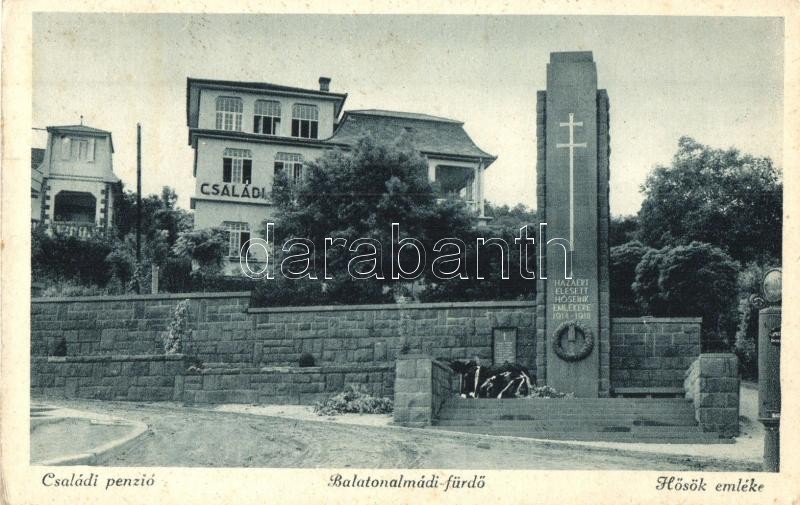 Balatonalmádi-fürdő, Hősök emlékműve, Családi penzió https://www.darabanth.com/de/299-Fernauktion/299.0/Ansichtskarten/Ungarn~500007/Balatonalmadi-furdo-Hosok-emlekmuve-Csaladi-penzio~II1599987