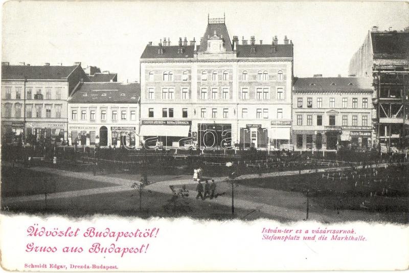 Budapest VII. István tér és a Vásárcsarnok, Laufer József bor- és sörháza, Hoffmann Albert kávé- és tejcsarnoka, Tichy József, Fuchs Ede, Bloch Salamon üzletei, Schmidt Edgar kiadása (EK)