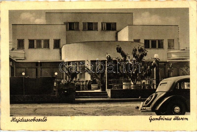 Hajdúszoboszló, Gambrinus étterem, automobil (EK) https://www.darabanth.com/de/299-Fernauktion/299.0/Ansichtskarten/Ungarn~500007/Hajduszoboszlo-Gambrinus-etterem-automobil-EK~II1604657