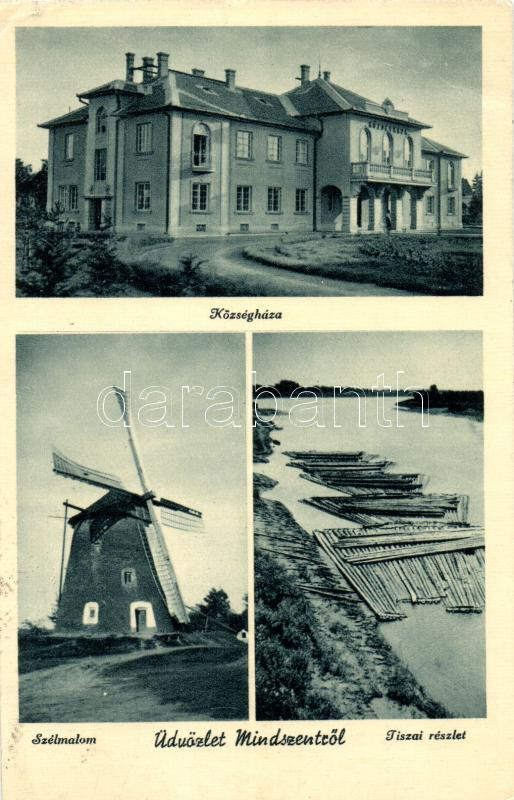 Mindszent, Községháza, Szélmalom, Tisza, faúsztatás (EK) https://www.darabanth.com/de/299-Fernauktion/299.0/Ansichtskarten/Ungarn~500007/Mindszent-Kozseghaza-Szelmalom-Tisza-fausztatas-EK~II1364324