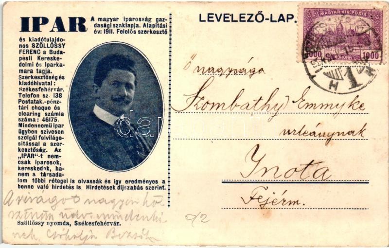 Ipar, a magyar iparosság gazdasági szaklapja, felelős szerkesztő és kiadótulajdonos Szöllősy Ferenc. Reklámlap, a Szöllősy nyomda kiadása / Hungarian economic journal advertisement card (EK)