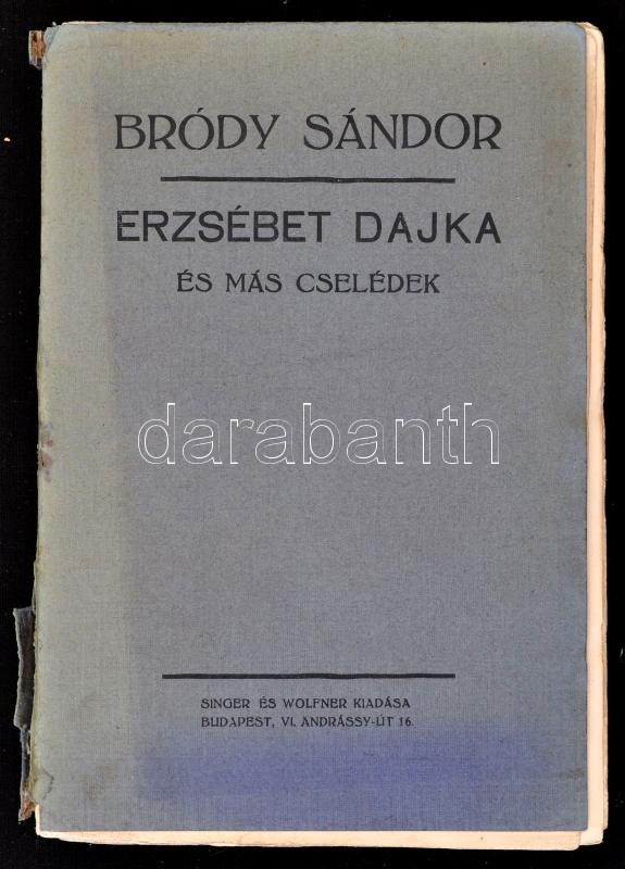 Bródy Sándor: Erzsébet dajka és más cselédek. Bp., é.n., Singer és Wolfner. Negyedik kiadás. Kiadói papírkötés, rossz állapotban, a gerince sérült, szakadt, a borítója elvált a könyvtesttől, a kötése sérült, 48 és 63 oldalak, és a 96-113 oldalak között a kötés elvált, a könyvből több lap kijár.