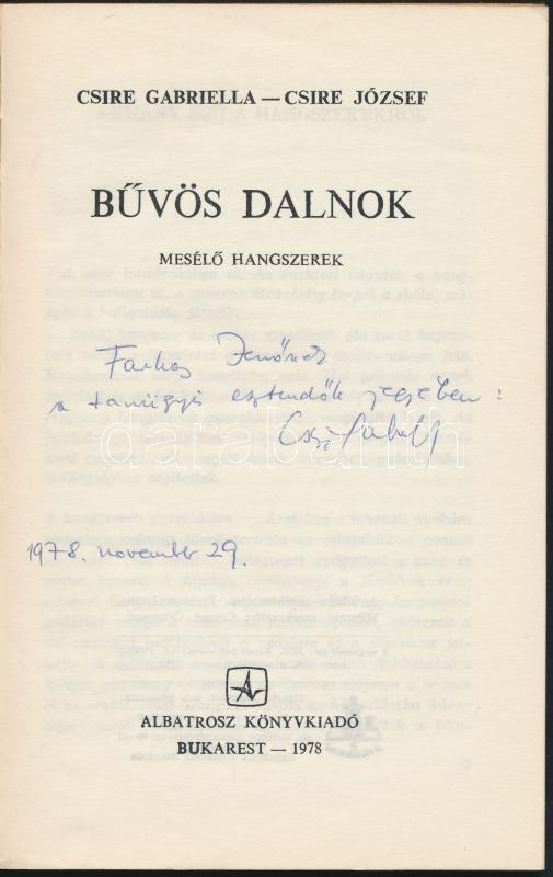 Csire Gabriella-Csire József: Bűvös dalnok. Mesélő hangszerek. Bukares... https://www.darabanth.com/de/299-Fernauktion/299.0/Bucher/Bucher-Andere-kuriositaten~200016/Csire-Gabriella-Csire-Jozsef-Buvos-dalnok-Meselo-hangszerek-Bukarest-1978-Albatrosz-Konyv~II1577181