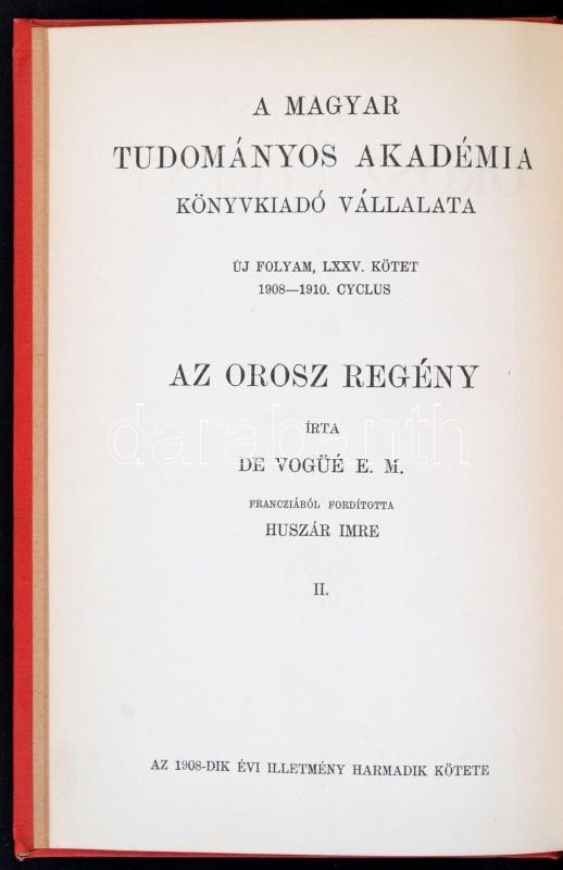 E. M. de Vogüé: Az orosz regény I-II. Fordította Huszár Imre. Bp., 190... https://www.darabanth.com/de/299-Fernauktion/299.0/Bucher/Bucher-Andere-kuriositaten~200016/E-M-de-Vogue-Az-orosz-regeny-I-II-Forditotta-Huszar-Imre-Bp-1908-MTA-Kiadoi-egeszva~II1504592