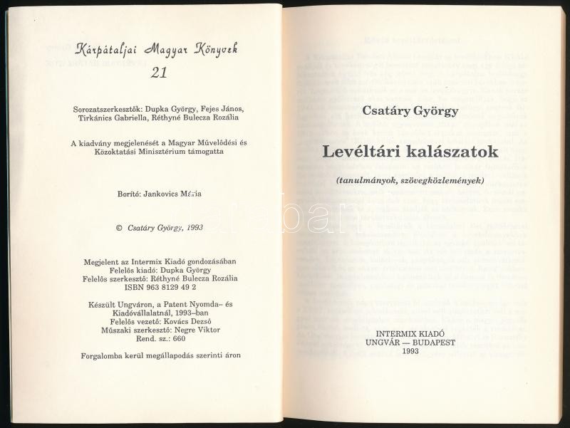 Csatáry György: Levéltári kalászatok. Ungvár-Budapest, 1993, Intermix ... https://www.darabanth.com/de/299-Fernauktion/299.0/Bucher/Bucher-Geschichte~200004/Csatary-Gyorgy-Leveltari-kalaszatok-Ungvar-Budapest-1993-Intermix-Kiado-Karpataljai-Ma~II1560485