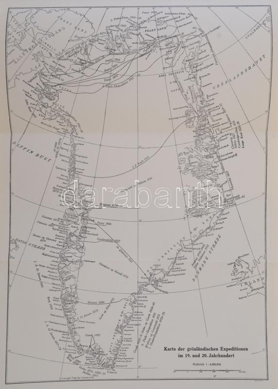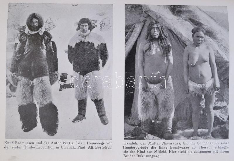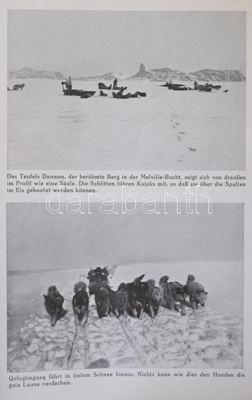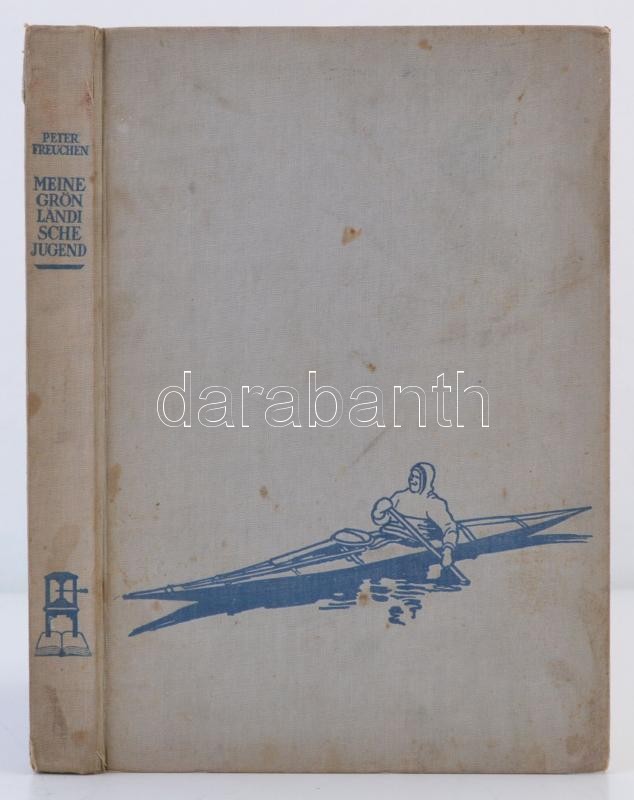 Peter Freuchen: Meine Gröndländische Jugend. Zürich-Wien-Prag, é.n., Büchergilde Gutenberg. Fekete-fehér fotókkal, és egy kihajtható térképpel illusztrálva. Kiadói kissé foltos egészvászon-kötés./ Linenbinding, with spotty cover, in German language.