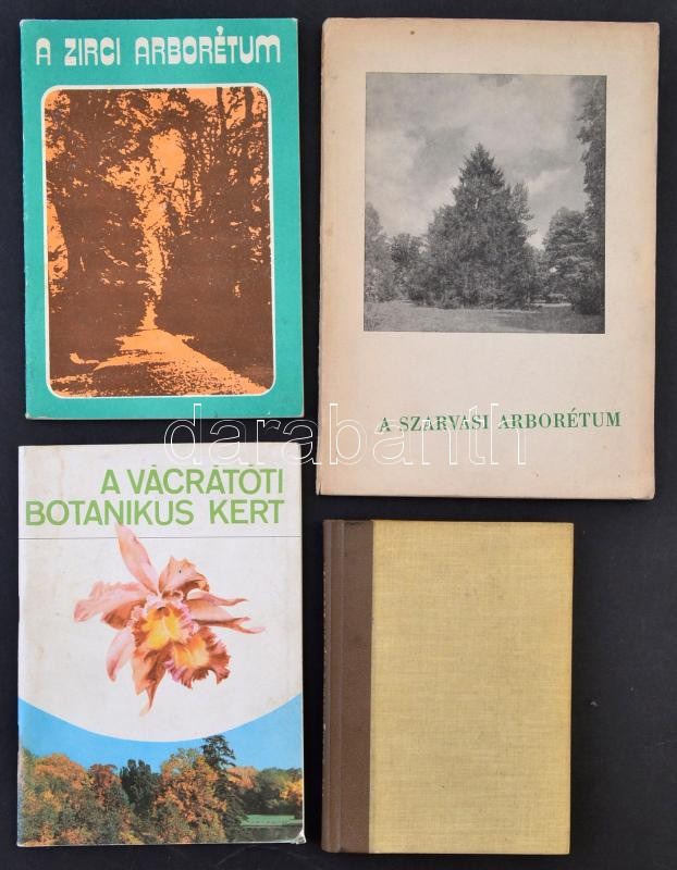 Vegyes könyvtétel, 4 db: Barangolások a soproni erdőkben. Szerk.: Dr. Gimes Endre. Bp., 1975, Panoráma. Átkötött félvászon-kötés, volt könyvtári példány. Dr. Ujvárosi Miklós, Tóth Imre: A vácrátóti botanikus kert. Vácrátót, 1979, MTA Botanikai Kútatóintézete. Kiadói tűzött papírkötés. Papp József: A zirci arborétum. Veszprém, 1983, MÉM Veszprémi Állami Erdőrendezőség. Kiadói tűzött papírkötés. A szarvasi arborétum. Szerk.: Bauecker Alajos, Dr. Gruber Ferenc. Bp., 1962, Mezőgazdasági Kiadó. Kiadói papírkötés.