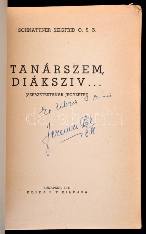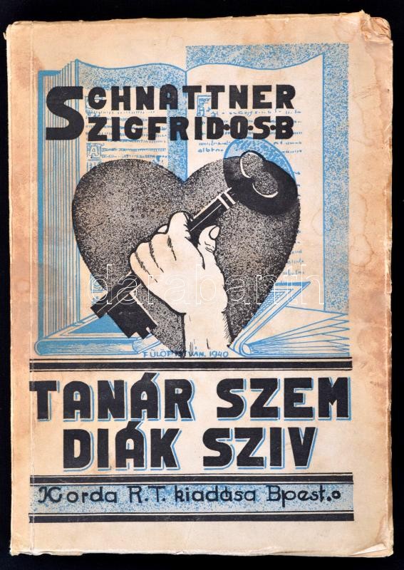 Schnattner Szigfrid: Tanár szem, diák szív. (Szerzetestanár jegyzetei.) Bp., 1940, Korda Rt. Kiadói papírkötés, kissé foltos, kissé viseltes borítóval, ex libris bejegyzéssel.