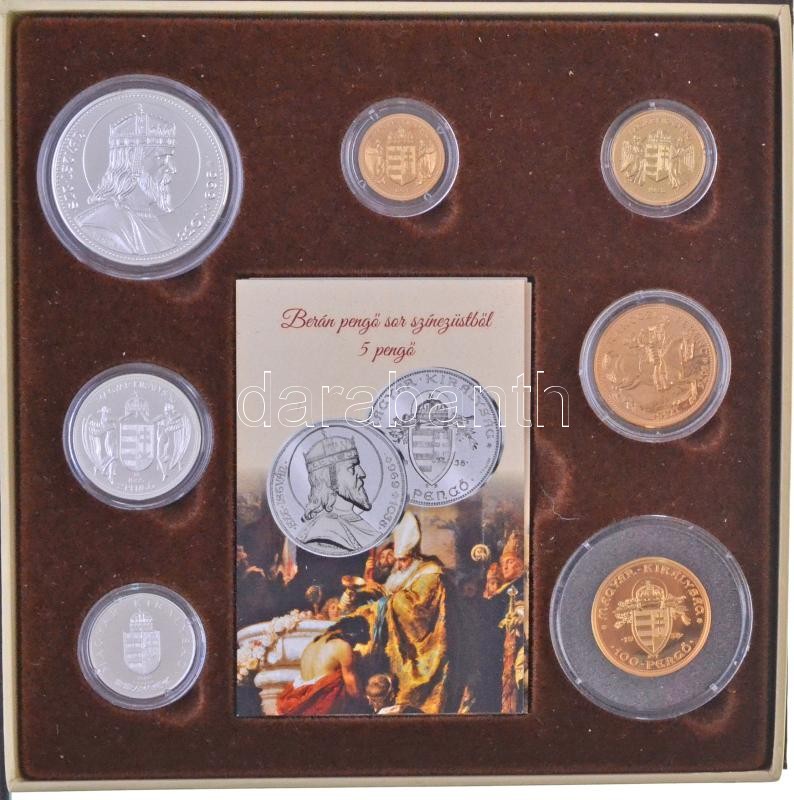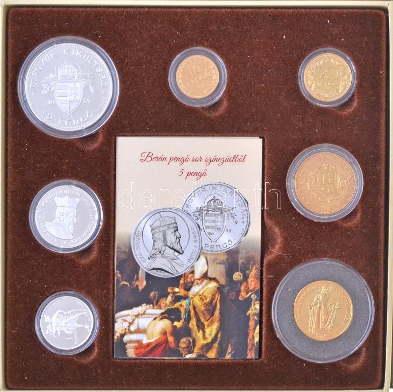 DN "Berán Pengő Sor színezüstből" a Berán Lajos által tervezett pengő pénzérmék Ag és aranyozott Ag utánveretei (7xklf), tanúsítvánnyal díszdobozban (összsúly: 89,9g/0.999) T:PP