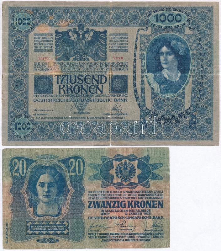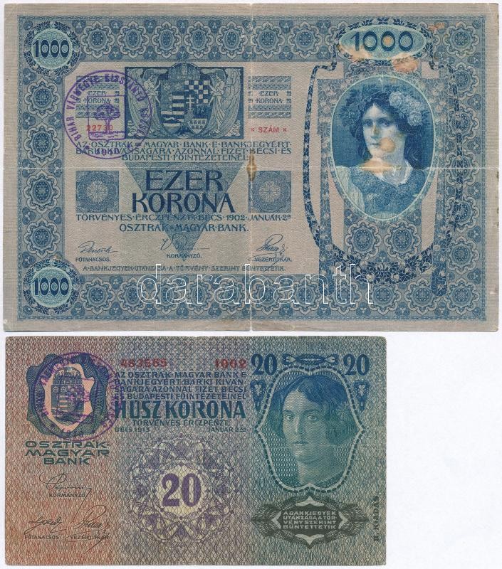 Beschreibung: 1913. 20K + 1902. 1000K mindkettő hamis "Bihar Vármegye Kisszántó Község 1910" felülbélyegzéssel (fake overprint) T:III,III-