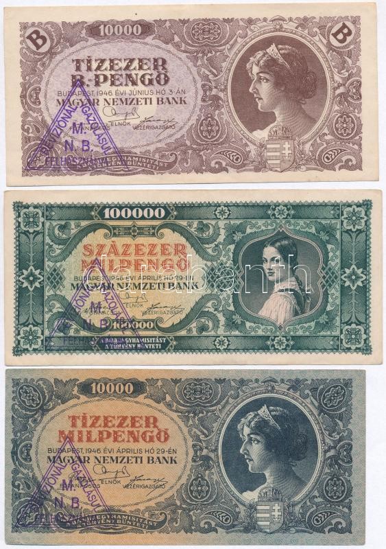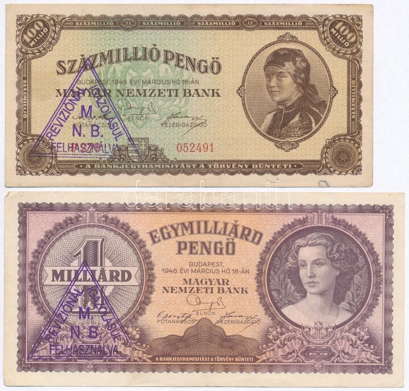 Beschreibung: 1946. 100.000.000P + 1.000.000.000P + 10.000MP + 100.000MP + 10.000BP mindegyik hamis "Revíziónál igazolásul felhasználva M.N.B." felülbélyegzéssel (fake overprint) T:II-,III