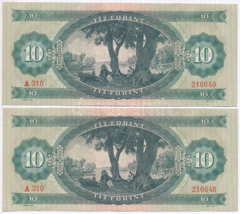 1962. 10Ft (2x) sorszámkövetők T:II törés nélküli hajtás https://www.darabanth.com/de/299-Fernauktion/299.0/Numismatik/Ungarische-Banknoten~400007/1962-10Ft-2x-sorszamkovetok-TII-tores-nelkuli-hajtas~II1597734