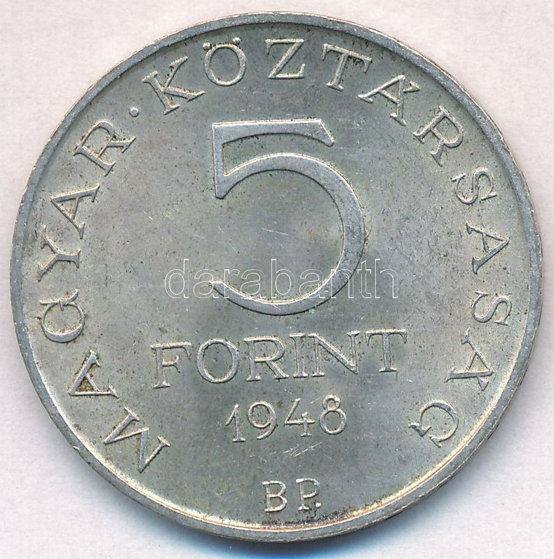 1948. 5Ft Ag "Petőfi" T:2 https://www.darabanth.com/de/299-Fernauktion/299.0/Numismatik/Ungarische-Munzen-und-Munzen-mit-ungarischem-Munzzeichen~400008/1948-5Ft-Ag-Petofi-T2~II1603009