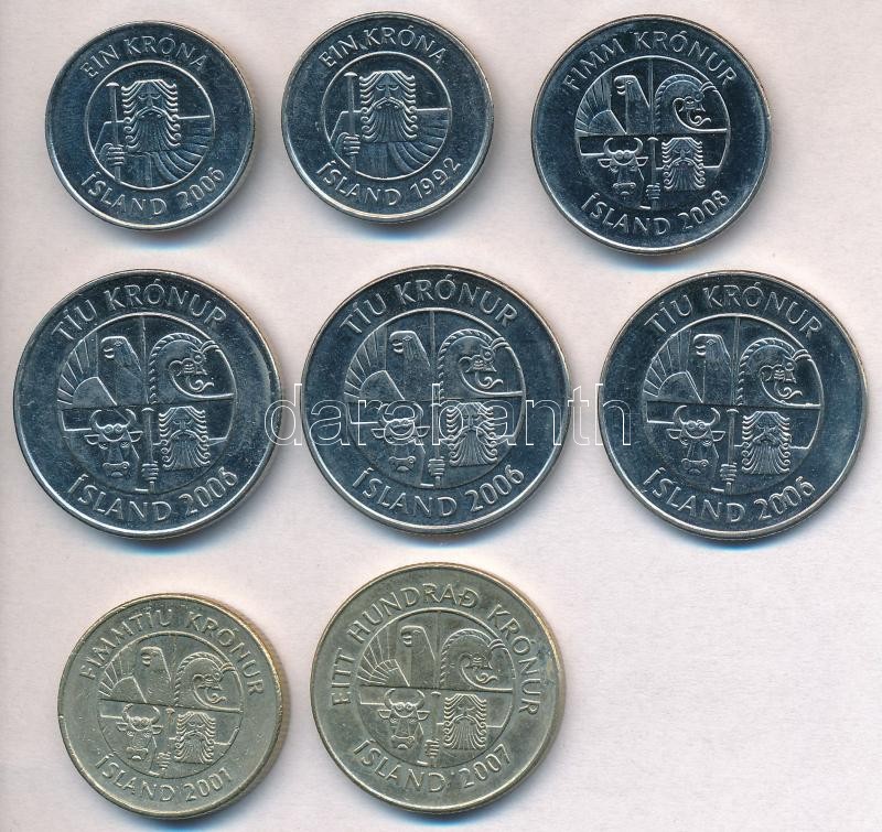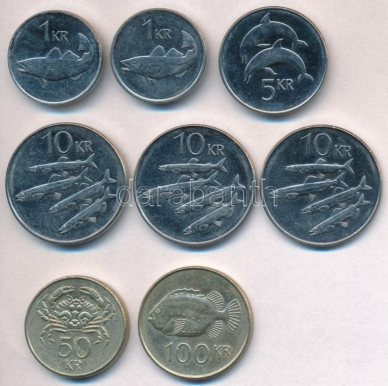 Izland 1992-2008. 1Kr (2xklf) + 5Kr + 10Kr (3x) + 50Kr + 100Kr T:2 Iceland 1992-2008. 1 Krona (2xdiff) + 5 Kronur + 10 Kronur (3x) + 50 Kronur + 100 Kronur C:XF