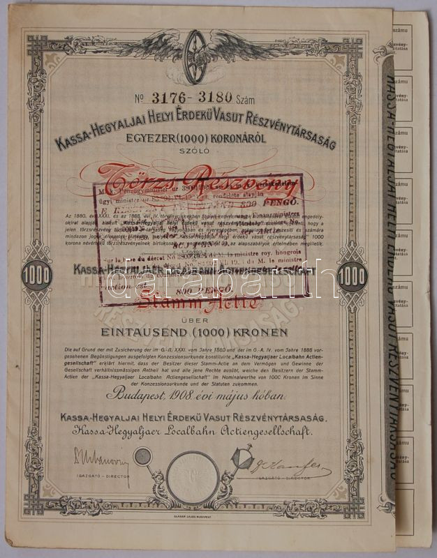 1908 Kassa-Hegyaljai Helyi Érdekű Vasút Rt. 1000K részvény / Kassa -He... https://www.darabanth.com/de/3-Gross-Auktion/3.1/Numismatik/~899/1908-Kassa-Hegyaljai-Helyi-Erdeku-Vasut-Rt-1000K-reszveny-Kassa-Hegyalja-Lokalbahn-AG-Stamm~II67713