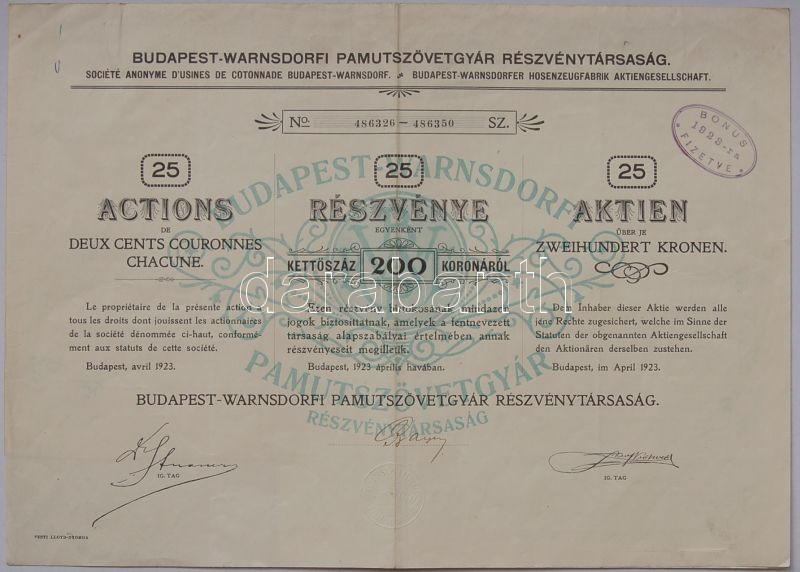1923 Budapest -Warnsdorfi Pamutszövetgyár 25x200K részvény / Hosenzeug... https://www.darabanth.com/de/3-Gross-Auktion/3.1/Numismatik/~899/1923-Budapest-Warnsdorfi-Pamutszovetgyar-25x200K-reszveny-Hosenzeugfabrik-Aktie~II67702
