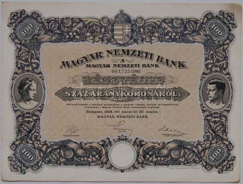 1924 Magyar Nemzeti Bank 100 aranykorona részvény / Ungarische Nationa... https://www.darabanth.com/de/3-Gross-Auktion/3.1/Numismatik/~899/1924-Magyar-Nemzeti-Bank-100-aranykorona-reszveny-Ungarische-Nationalbank-100-Goldkrone-Aktie~II67716
