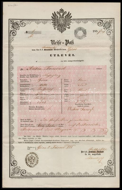 1858 Útlevél Kőszegről 6kr szignettával / Passport from Güns https://www.darabanth.com/de/30-Gross-Auktion/30.1/Andere-Sammelgebiete/Dokument~12209/1858-Utlevel-Koszegrol-6kr-szignettaval-Passport-from-Guns~II1864253