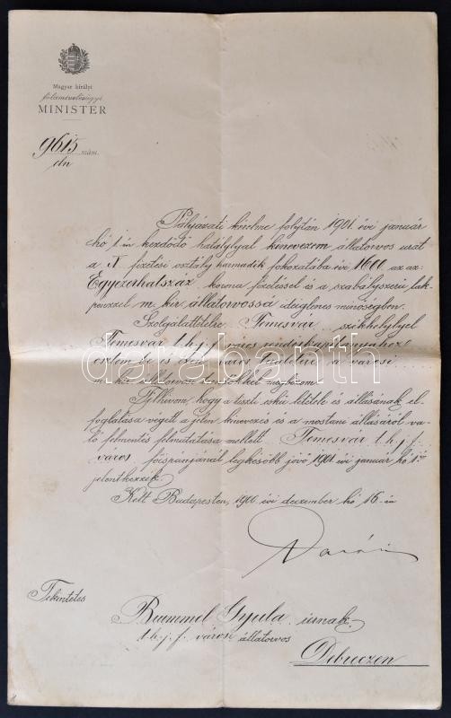 Beschreibung: 1900 Budapest, állatorvosi kinevezés Bummel Gyula temesvári állatorvos részére, Darányi Ignác (1849-1927) földművelésügyi miniszter aláírásával, fejléces papíron