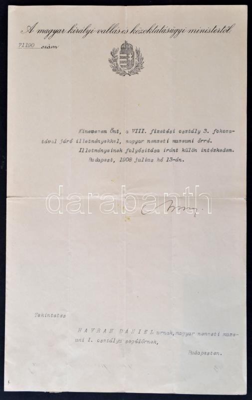 1908 Budapest, múzeumi őri kinevező okirat Havran Dániel múzeumi segéd... https://www.darabanth.com/de/30-Gross-Auktion/30.1/Andere-Sammelgebiete/Dokument~12209/1908-Budapest-muzeumi-ori-kinevezo-okirat-Havran-Daniel-muzeumi-segedor-reszere-Apponyi-A~II1861822