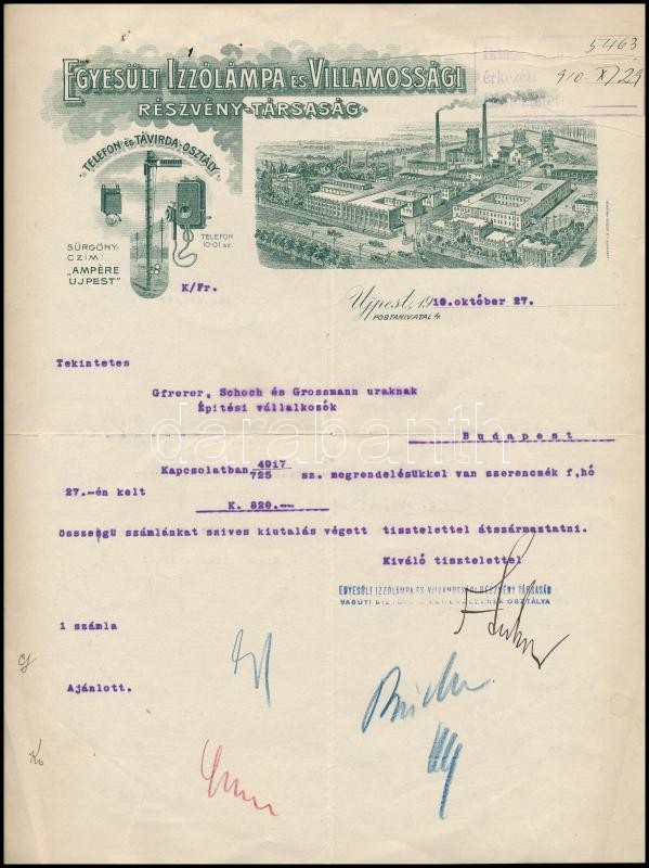 1910 Aschner Lipót (1872-1952), az Egyesült Izzólámpa és Villamossági Rt. vezérigazgatójának gépelt,aláírt levele hivatalos ügyben Gfrerer, Schoch és Grossmann építési vállalkozóknak, díszes fejléces papíron