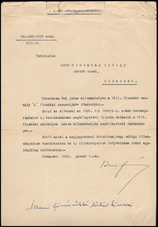 Beschreibung: 1926 Budapest, főmérnöki kinevezés Szovátay György részére, Bud János (1880-1950) pénzügyminiszter aláírásával, fejléces papíron