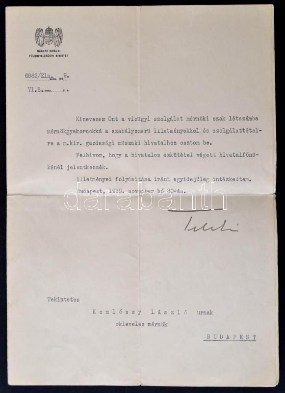 1939 Budapest, vízügyi mérnöki kinevezés Komlóssy László okleveles mérnök részére, Teleki Mihály (1896-1991) földművelésügyi miniszter aláírásával, fejléces papíron